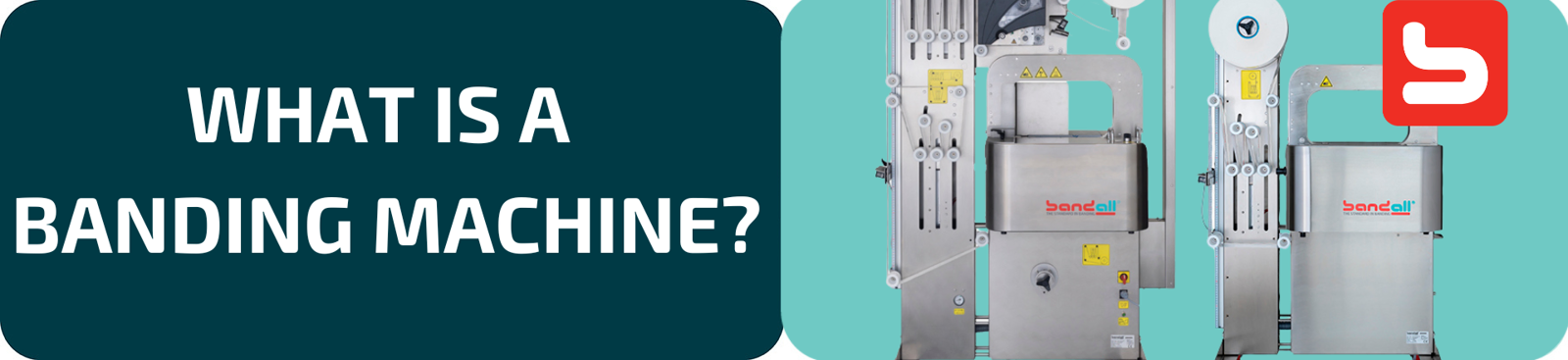 A banding machine wraps a narrow strip of paper or film banding material around a product and seals it securely. The band holds individual products or multiple items together without fully enclosing them.
