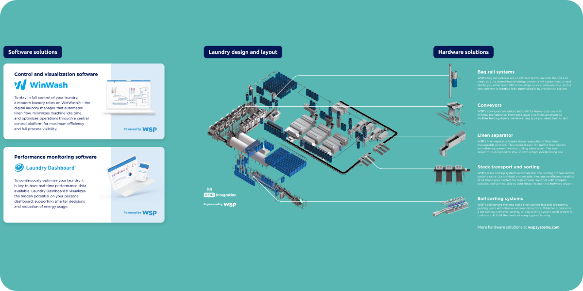 WSP Systems is een gevestigde naam binnen de industriële wasserijsector. Als leverancier van procesautomatisering is het bedrijf gespecialiseerd in de ontwikkeling en bouw van transportsystemen voor linnen- en mattenwasserijen. De projecten die WSP uitvoert zijn maatwerkoplossingen, gericht op het optimaliseren van het logistieke proces binnen de wasserij.